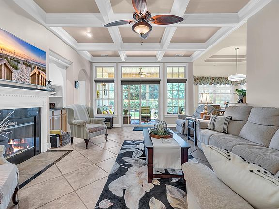 Wood-burning fireplaceLush landscapingCoffered ceilingJetted tubSunsetter awningsOrnamental columnsLvp and tile flooring