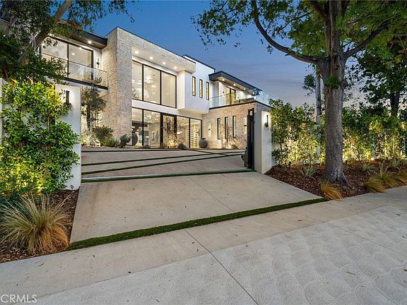 This newly built, contemporary modern masterpiece is located south of the Boulevard in Encino. The landscaped front yard and large glass entrance welcome you to a beautifully designed property featuring high ceilings and luxurious finishes throughout. The open foyer showcases a floating glass staircase alongside a formal living room and an elegant dining room, adorned with alabaster stone light fixtures. A stunning wine wall made of limestone bricks features floating glass racks.