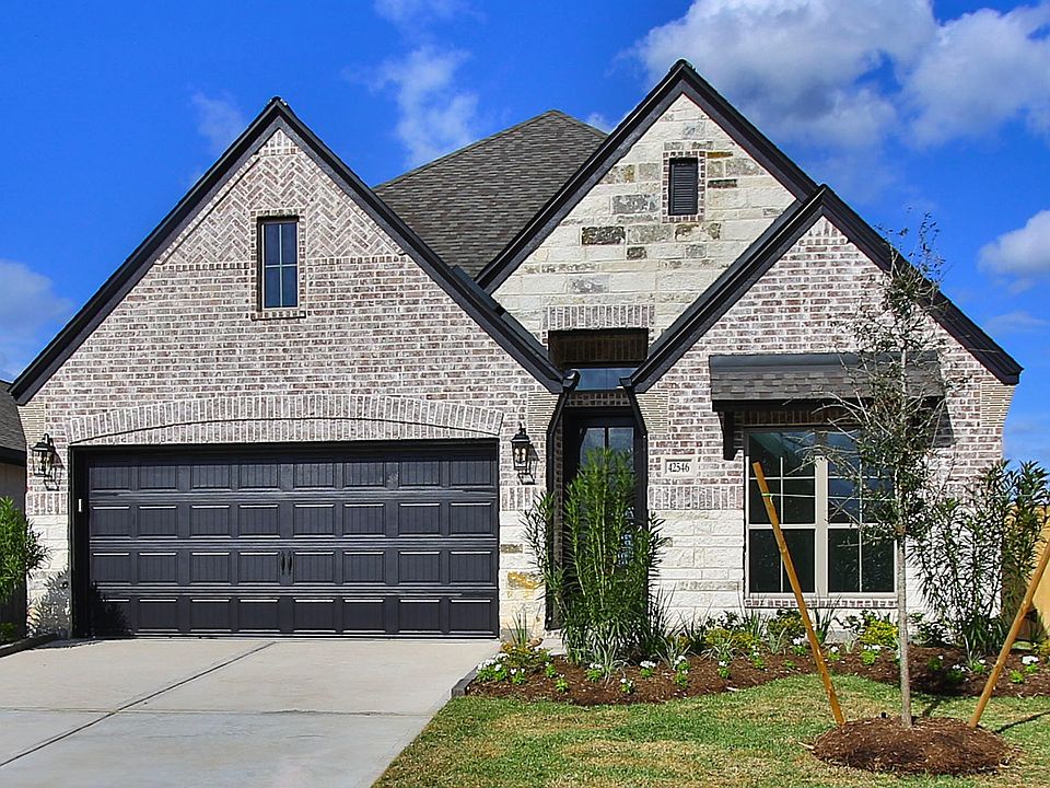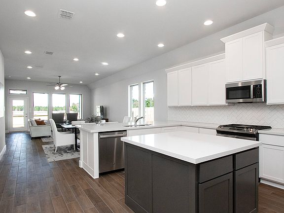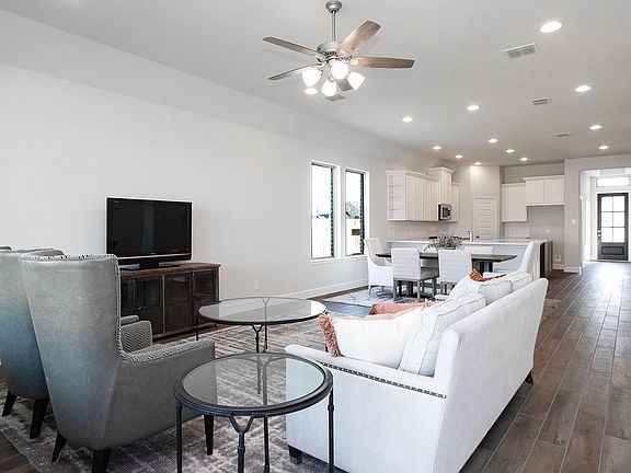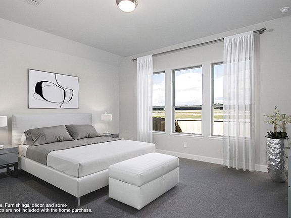 Entry framed by home office with French doors. Open family room with wall of windows extends to the kitchen and dining area. Kitchen features an island with built-in seating space and a corner walk-in pantry. Secluded primary suite with three large windows. Primary bathroom offers a French door entry, dual vanities, garden tub, separate glass enclosed shower and a large walk-in closet. Secondary bedrooms offer a walk-in closet. Utility room. Covered backyard patio. Mud room just off the two-car garage. Representative Images. Features and specifications may vary by community.