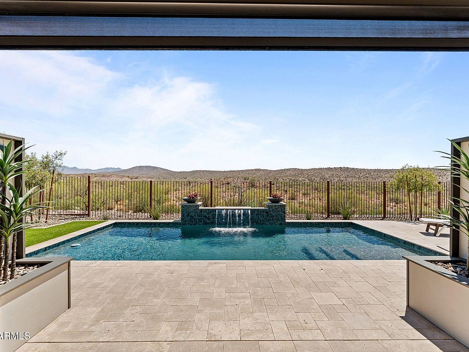Welcome to this beautifully upgraded home in the desirable community of Wickenburg Ranch. This thoughtfully designed residence has an east facing backyard and backs to a desert oasis offering gorgeous mountain views with no homes behind. Featuring an open floor plan with a large wall of sliding glass doors, this home creates a seamless flow to the incredible private backyard. Step outside to a covered patio with a motorized sun shade which fully encloses your patio, overlooking a sparkling heated and cooled pool with a soothing water feature and a self-cleaning system. The low-maintenance landscaping, including artificial turf, ensures you spend more time relaxing and less on yard work. This home comes equipped with a water softener and an owned solar system. Inside, the upgraded kitchen offers an induction cooktop, sleek cabinetry and a reverse osmosis water system. With two bedrooms, two bathrooms, and high-end finishes inside and out, this home perfectly combines comfort, functionality, and resort-style living.