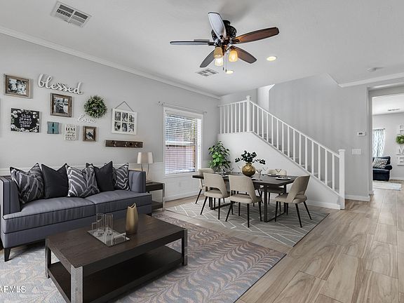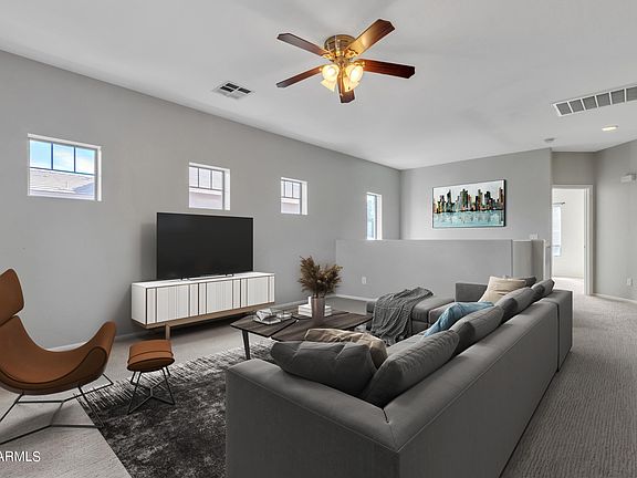 This beautiful 4-bedroom, 2.5 bathroom Ashton Woods home is nestled in the highly desirable community of Highland Groves at Morrison Ranch and has brand new carpets throughout, updated bathrooms and so much more! The lower level boasts a spacious living room/dining room, then flows into the great room ideal for gatherings. Downstairs you will also find the kitchen that is equipped with shiny stainless-steel appliances, a new large capacity refrigerator, tons of updated white cabinetry, granite countertops, a cozy island, breakfast bar, walk-in pantry and don't forget about the laundry room and half bathroom. Upstairs is an oversized loft with plenty of space for family relaxing, playtime or even a home office. The 4 bedrooms upstairs are spacious and both bathrooms upstairs have been newly updated. The amenities don't stop there...step into the backyard to relax in the sparkling pool with covered patio and extended pavers...the perfect spot for hosting backyard barbecues.