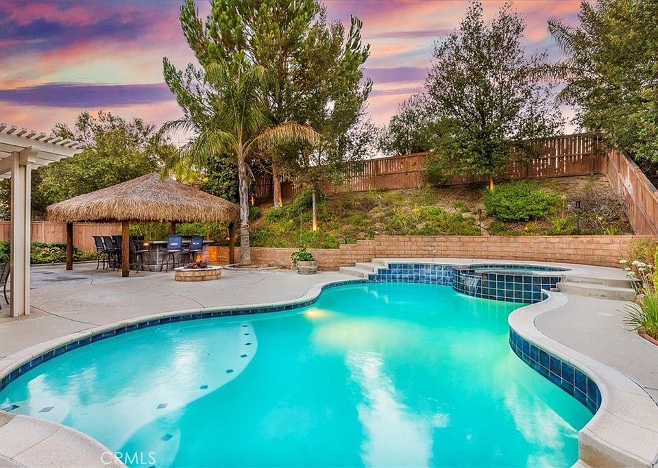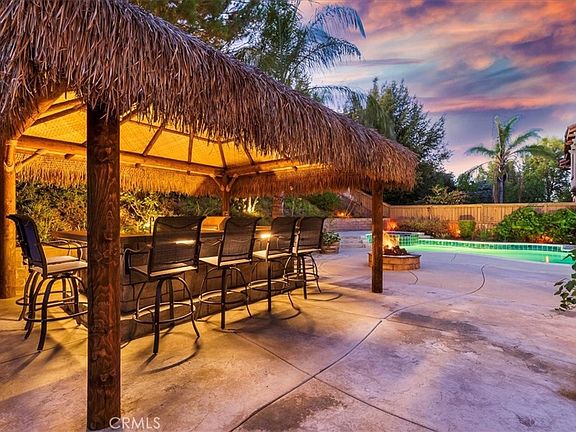 Welcome to your new POOL home in the prestigious CROWNE HILL community of Temecula! Located on a quiet cul-de-sac, this 4 bedroom, 3 bathroom 2748 sq. ft. home has views of the Temecula Valley Wine Country and early morning hot air balloons from upstairs. Downstairs features wood floors, formal living room, family room, dining room, 1 bedroom and remodeled half bathroom. The remodeled open plan kitchen has white cabinets, large granite peninsula island and is open to the family room, perfect for entertaining guests. The butler's pantry and walk in food pantry completes this perfect cook's kitchen. Step outside into the OASIS dream backyard where you'll find the newly added outdoor kitchen, complete with a built-in BBQ bar, seating for 8+ people, a flat top griddle, BBQ grill, sink, refrigerator, and plenty of storage. The outdoor kitchen has electrical, water, and gas hook ups, as well as attached lighting inside and out of bar with extra outlets. The newly built waterproof and weatherproof 4 post PALAPA has real roof lining and thatch roof to last many years without upkeep. The sparkling heated pool, jacuzzi, and firepit complete the perfect entertaining space for your pool parties or a solo retreat. Relax under the covered patio complete with a fan for a cool breeze on hot days. The property has multiple fruit trees including apple, pomegranate, avocado, lime, guava, cherry plum, as well as a grapevine, blackberries, lavender, and rosemary. 3 bedrooms, 2 full bathrooms upstairs as well as a loft perfect for a home office, gym, or entertainment room. The primary bedroom with ensuite has a jacuzzi tub, walk in closet and double vanity sinks. The laundry room is conveniently located upstairs as well with included washer and dryer. New interior and exterior paint as well as a new garage door. Low HOA which includes a park at the end of the street with a playground, basketball courts, walking trail, horse trail, and community events such as summer movie nights at the park, food trucks, and holiday celebrations. Just 1.5 miles away from grocery stores and restaurants, 2 miles from Temecula Wine Country and tasting rooms, and 10 minutes away from Old Town Temecula. This home was given a lot of love and is ready to find its new owner. Don't miss this opportunity to make this house your new home!