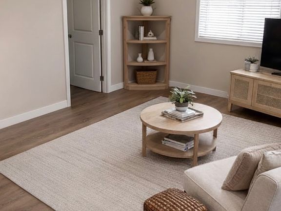 Contemporary Interior: Open-concept living space with fresh paint, modern cabinetry, and durable wood-style laminate flooring throughout.