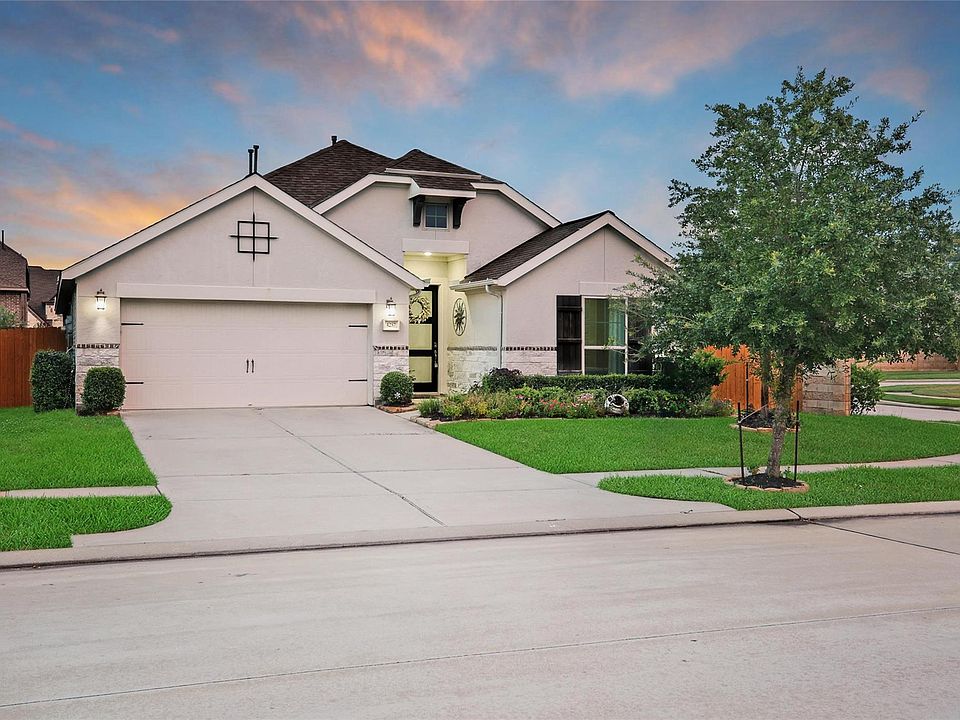 PRIME LOCATION & situated on a CORNER LOT. Easy access TX 99, I45, & Hardy Toll Rd. Only minutes to all The Woodlands has to offer and a short commute to DOWNTOWN Houston, with lots of nearby shopping & dining. STUNNING 1 story home with stucco, stone, & brick elevation w/ an open floor plan features 4 BEDS, 3 BATHS, and 2 car attached garge. QUARTZ ISLAND kitchen has white cabinets, seating area, & stainless-steel appliances opens to breakfast nook, family room with corner gas fireplace, dining invites entertaining. PRIMARY retreat with his and her vanities, soaking tub, separate shower, & walk in closet. FORMAL dining, glass French doors to home office, plus generous secondary bedrooms. Wood like tile throughout main living areas. HIGH CEILINGS, window coverings, covered back patio w/ spacious backyard. Refrigerator, washer, & dryer. Solar panels. Residents enjoy master planned amenities & top-rated Conroe ISD schools including GRAND OAKS HS. Call today! Make this home yours.