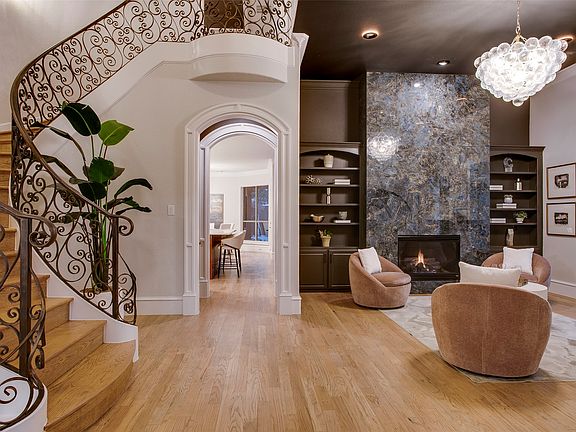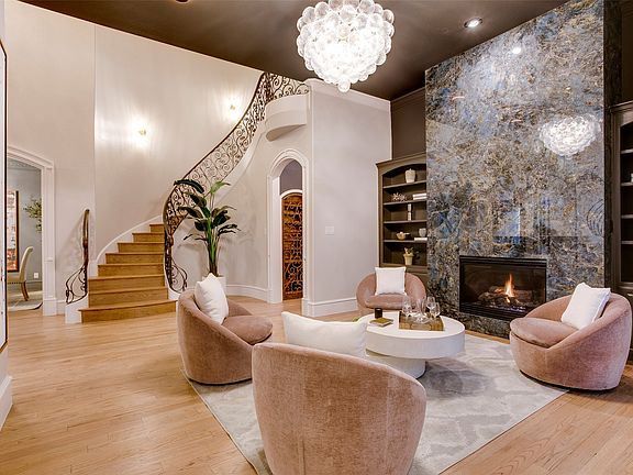 Sparkling pool and spaMarble fireplaceOutdoor kitchenBackyard oasisStainless steel appliancesCovered patioFormal dining
