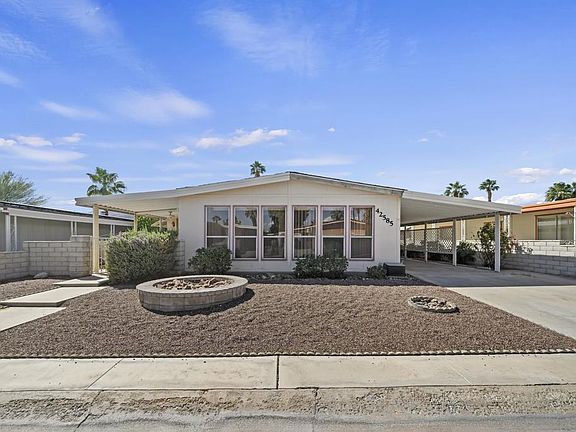 PRICE REDUCTION!! Spacious double-wide manufactured home in the highly sought after 55+ Portola Country Club. This large two-bedroom, two-bath floor plan boasts both a living room and a family room, a u-shaped kitchen with a dual oven and an abundance of cabinetry, and a master bedroom with a massive wall closet, wide master bath and private covered patio. The long-covered carport, storage shed, indoor laundry room, vertical blinds throughout, and wet bar off the family room are just a few of the great conveniences this home has. This active-adult community features an 18-hole par 3 golf course with beautiful mountain views, pickleball courts, 3 pools, and a clubhouse with a pub and fitness room. The modest HOA fee includes all of these amenities in addition to security, cable and internet. The best community in the central Coachella Valley within this affordable price-point that offers a great home in an ideal location with this many perks. The home is on PERMANENT FOUNDATION & has a 433(a).
