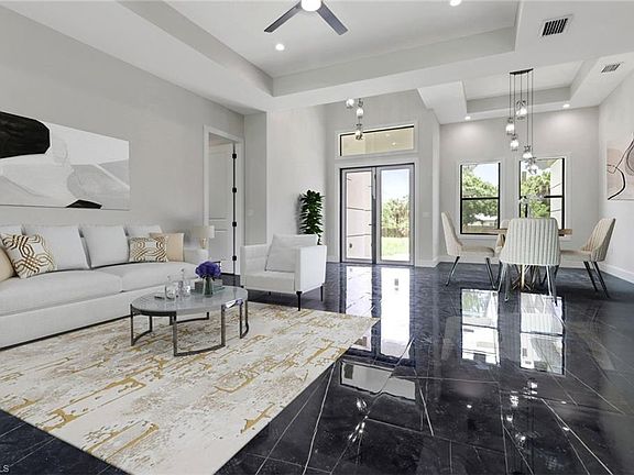 Discover this beautiful brand-new home situated on over 2.7 acres of land, offering more than 2,200 sq. ft. of luxurious living space.This home features 3 generously sized bedrooms and 3 full baths, plus a versatile flex space that can serve as a recreation room, home office,or media room, complete with a closet, private bath, and wet bar. Inside, you'll find stylish tile flooring throughout, impact-resistant windows and doors,a waterfall kitchen island, and an upgraded appliance package. The lanai, equipped with a wet bar, is perfect for enjoying your morning coffee or evening cocktail while overlooking the landscaped yard. Entertaining is effortless with the chef's kitchen that opens to a large great room featuring sliding doors to the lanai. Guests can relax at the kitchen island and chat while meals are prepared. The café dining area is ideal for casual get-togethers, while the formal dining room is perfect for holidays and special occasions. The primary bedroom suite offers a spacious walk-in closet, dual sinks, a walk-in shower, and a private water closet. Additional upgrades include decorative wood trim around the windows,ceiling fans, lighting fixtures, and a whole-house reverse osmosis system. The 2-car garage provides ample storage space. This home exemplifies comfort, style, and quality living.