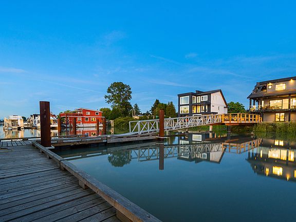 An exceptional waterfront property offers an unrivaled blend of luxury+stunning VIEWS year round, sunrise to sunset!Floor-to-ceiling windows frame breathtaking panoramas of the water+mountain peaks,inviting the outdoors in and bathing each room in natural light.Designed for both sophisticated living and effortless convenience, home features an open-concept layout enhanced by state-of-the-art finishes, a gourmet kitchen,A/C +elevator,HIGHQ windows,multiple decks. Total 5 bedrooms + 5 bathrooms (all ensuite)-the primary suite is breathtaking- luxurious ensuite+walk in shower with views!Every detail has been designed to provide an indulgent retreat for family and guests alike! 3785sf living space.Roof top deck!Private dock (60' boat capacity)float home area (rental?) boat moorage!