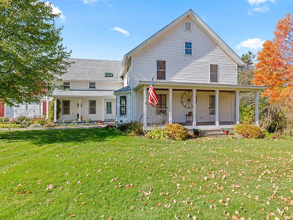 Welcome home! This Vermont farmhouse set on over 55 acres near Elm Hill Farm will leave you breathless. The vintage details are unmatched including wide-plank wood floors throughout, original sliding pocket doors, vintage light fixtures, board-and-batten walls, and a charming checkered tile entry. A spacious foyer welcomes you into the main level, open to a formal sitting room which transitions into the formal dining space. The kitchen offers easy flow to both formal and casual dining spaces, creating a perfect layout for everyday living and entertaining. An additional cozy family room centers around a hand-laid stone fireplace. Large windows fill the living areas with natural light, a main-level office provides flexibility for remote work, creative space, or study. Upstairs, four generous bedrooms & two full baths provide peaceful retreats with classic farmhouse character and ample storage. Outside, two covered front porches invite quiet moments and seasonal enjoyment. A new barn-style garage with concrete floor offers great space for storage, workshop use, or hobbies. The 55-acre parcel includes open pasture currently hayed by a local farmer and borders Vermont-protected wetlands that enhance the natural views and privacy. A separate-entry apartment offers flexible living or income potential. Great opportunity for multi-generational living or a family homestead. Recent updates include a newer furnace, windows, roof and central AC. Conveniently located near in Colchester VT.