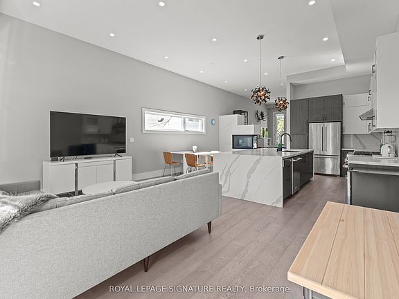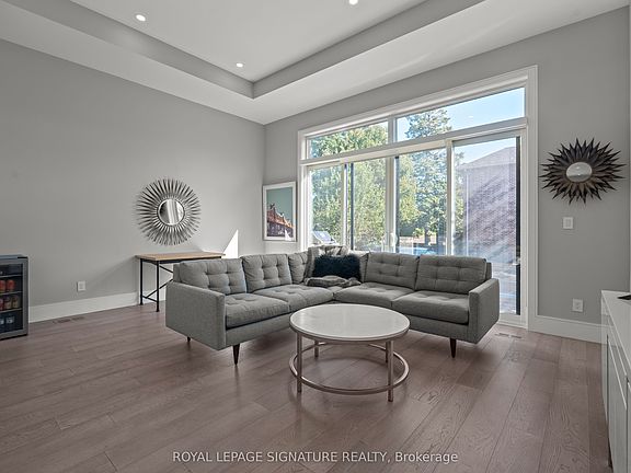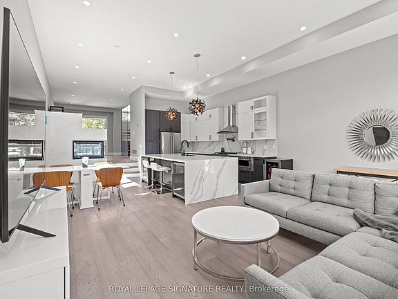 Stunning contemporary luxury home showcasing top-of-the-line custom design and high-end finishes throughout. This residence features wide-plank hardwood floors, 12 ft ceilings, and an open-concept layout that seamlessly blends the kitchen, dining, and family room areas. The chefs kitchen is equipped with a custom design, luxury appliances, and an impressive 10 ft island, with a walkout to a spacious deck and private backyard, perfect for entertaining. Elegant skylights and a striking two-way gas fireplace add warmth and natural light to the main living areas. The primary suite offers a private balcony, custom walk-in closet with built-ins, and a spa-inspired ensuite bathroom. The lower level is finished with heated polished concrete floors, full walkout, and ample space for recreation or a home gym. Conveniently located near top-rated schools, parks, golf courses, shops, transit, the Lakeshore, and major highways, this home delivers both luxury and lifestyle.