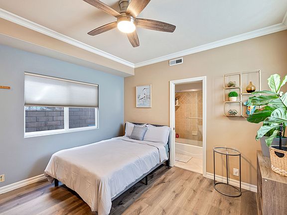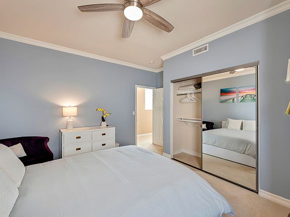 Bedroom 1: King bed, Smart TV, ensuite bathroom, double closets, oversized sliding doors (primary bedroom)