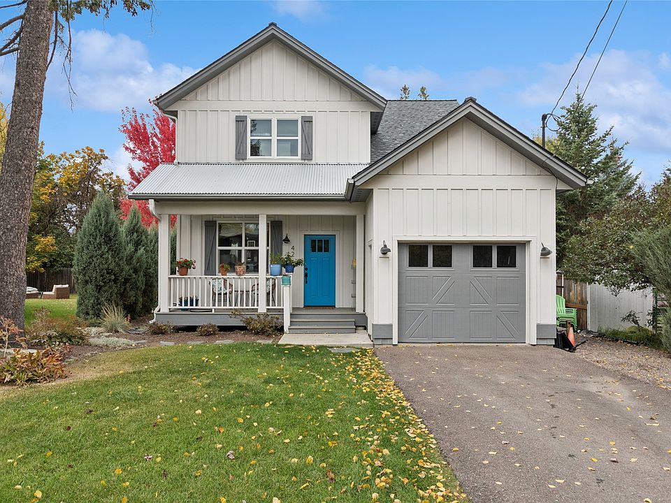 Distinctive details include a sliding barn door, chalkboard accent wall, and Heath handmade tile accents in the kitchen and fireplace surround. The primary suite showcases views of Whitefish Mountain Resort, while the back porch and BBQ area provide a welcoming outdoor space.