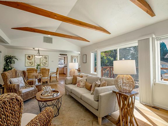 Single level 1930's Mediterranean on large, private lot within walking distance of beach, seaside coffee shops, restaurants, shopping, golf and tennis. A Saltillo tile entry walk and the hand-troweled exterior stucco create a feeling of warmth which continues into the home with plaster walls and vintage wide-plank hardwood floors. Both the living and separate family rooms feature wood burning fireplaces and the main open living area is 28' X 15' with a vaulted ceiling opening to a private, sunny rear deck overlooking large flowering Camellias, a pink Magnolia Tulip tree, Avocado and lemon trees. Two bedrooms with vaulted ceilings and two full baths. Large 2 car garage. There's even a custom greenhouse with vintage Pella wood windows. Charm, style and location. Newer roof, exterior paint and deck.