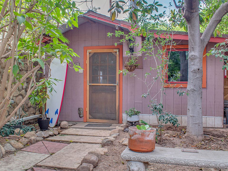 Private Cottage Bungalow tucked away among the unique landscape. This 2 bedroom is a special opportunity! Upon entering the fully gated property you'll notice the beautiful mature trees, rock walls, brick walkways, exotic fruit trees and flowers. The cottage is tucked back on a double lot property, you'll feel like your in your own world. Once inside the cottage you'll experience an open feeling throughout the living spaces. There is a wood burning stove in the living room, a cozy sitting room that leads to a generous sized kitchen overlooking the back patio. The larger bedroom offers lots of windows and a direct access to patios and the detached studio / office / cabin. The 8500 sqft lot is complete with multiple private patios, outdoor showers, private hot tub area, gardens and more