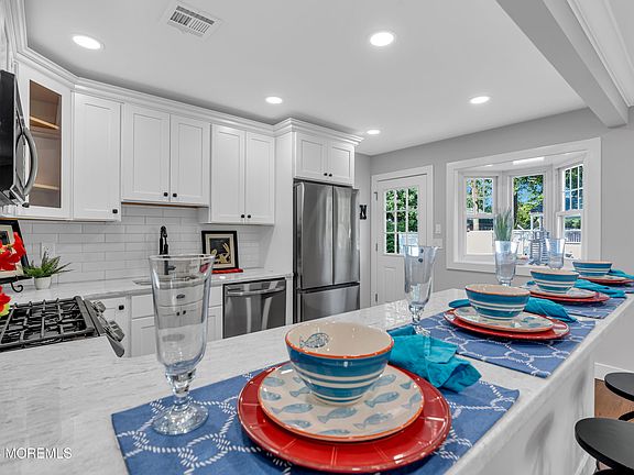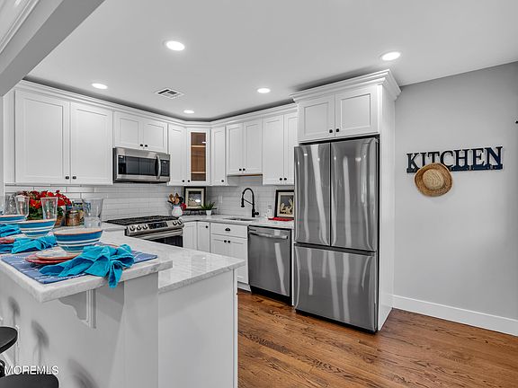 Grand Renovation! Nothing left to do except move in your furniture and start enjoying your home from Day 1!. Not your typical Shark River Cape with Primary Bedroom and en suite bath on main level. Open floor plan features classic white shaker cabinetry with upgraded granite counter tops featuring 4 bar stool eating area, stainless steel appliances, recessed lighting finished in beautiful hardwood flooring flowing into the Living room with hardwood flooring and recessed lighting accented with crown molding. Full remodeled bath with ceramic tub surround complete the main level. Upstairs features 2 Bedrooms for family or guests. Basement has two separate finished rooms perfect for family room, office or exercise room plus additional area for storage with outside entrance to rear. The renovation list is endless and the design is for today's living style. Updates include New Roof, New Vinyl Siding, New Central Air, New Hot Water Heater, Panel Box, Gutters, Soffits and Driveway! Minutes to Everything, Beaches, Shopping, Highway's and Restaurants. Please note: Grass has been enhanced and some rooms and areas have been digitally staged for illustrative purposes only.