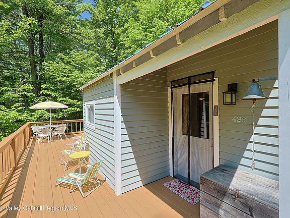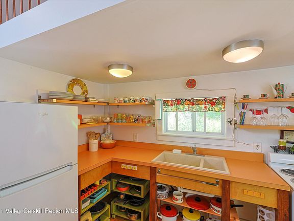 Walk in the front door to a bright and cheerful eat-in kitchen with a wood stove to keep you toasty on those chilly Catskill evenings. Beautiful pine flooring through to the living room with plenty of space for playing games and music, watching movies, reading, whatever your heart desires. Up the finely crafted staircase is the larger of the two loft sleeping spaces (providing additional approx 175 sq ft). Here you'll find three possible sleeping spaces with plenty of room for extra linens and personal items. The second loft currently fitted with a single bed, this space is sure to delight the one who wants to snuggle up and read the night away. A sliding glass door from the living room opens to a large deck that fronts the entire cottage for morning coffee, dining, sunbathing and more lounging.