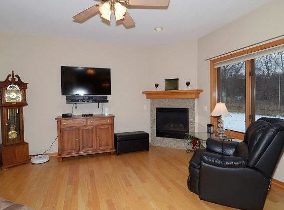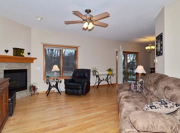 Enjoy condo living with the feel of a single family home. Bright and sunny end unit is nestled in a quiet residential area easily accessible for commuters of I94. Many upgrades: gas fireplace, vaulted ceilings, hardwood floors, breakfast bar, and Corian countertops. Peaceful & private screened porch off kitchen overlooking woods & green space. Large 2 car garage & exposed finished lower level. New stainless steel kitchen appliances & new carpet upstairs/hallway & bedrms Aug 2013!