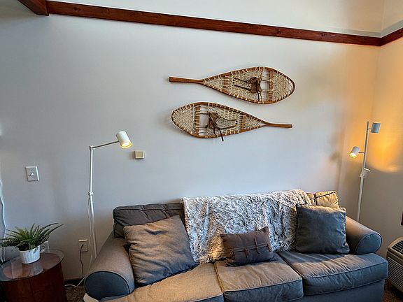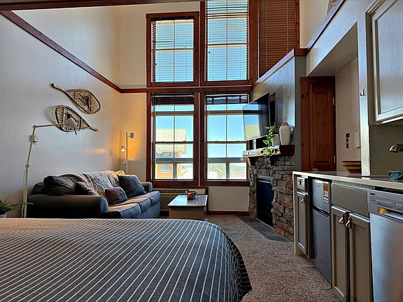 Rare find in the heart of the Village! Newly remodeled, this sought-after top floor Rimfire Lodge unit lives large with sky high windows, sweeping views, and stylish chalet interior. The updated kitchenette boasts quartz countertops, extended prep space, undermount sink. leather pulls and even a dishwasher! The spacious bath was redone with new vanity, penny tile floors, mirror, sconce, subway tile surround and walk-in glass shower with unique shampoo and shaving niches. All new fixtures, decor, and hardware throughout, down to the doorknobs. Comfortably sleeps 4 with a sturdy black steel queen bed frame (with ample space for luggage storage underneath) and queen sleeper sofa. Steps from Ballhooter Lift, it's easy to ski! Then get cozy in front of the gas fireplace while enjoying the Village vibe outside. Iconic Rimfire Lodge offers mountaintop convenience, ski storage, outdoor hot tub, sauna, fitness center, and underground parking garage. HOA $627/month
