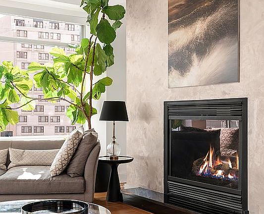 Entering the home via a private keyed elevator, you are met with a long gallery that separates the grand entertaining spaces from the serene private quarters. A huge living and dining area with southeast views boasts a gas fireplace and a terrace with iconic Manhattan views. The crisp, contemporary chef’s kitchen boasts a suite of appliances by Viking, SubZero and Bosch, granite countertops and ample storage solutions, as well as opening onto a northwest facing balcony.