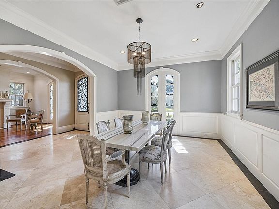 Travertine and wood flooring, plantation shutters, paneled doors, crown molding, recessed lighting and custom built-ins. Inviting living room with fireplace provides a retreat or a study. Kitchen with high-end appliances, including a built-in refrigerator, large center island and walk-in pantry. The second floor features three spacious bedrooms and three full baths, including a primary bath with double sinks, shower, jetted tub and private water closet. The finished third floor includes a full bath and offers a flexible space. Classic stucco exterior accented with Juliette balconies offers elegant curb appeal and charming outdoor spaces. Landscaped front and backyards, attached garage and fenced patio area. Located near Rice Village, West University parks and the Medical Center.