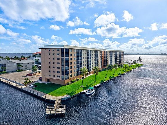Step into a world where elegance meets comfort in this beautifully renovated waterfront residence offering refined living and expansive canal and river views. Completely updated in 2021, this fourth-floor condo features modern finishes, new tile flooring throughout, and a bright open layout designed for today’s lifestyle. The sleek kitchen showcases shaker-style cabinetry, quartz countertops and backsplash, and premium Bosh and Samsung appliances — perfect for cooking or entertaining. The redesigned primary suite includes a spacious walk-in closet not found in other units and captures stunning water views to begin and end each day in serenity. A large personal storage area is also included, ideal for bikes, beach gear, or seasonal items. Enjoy breathtaking sunsets from your screened lanai with desirable southwest exposure overlooking the wide canal and Caloosahatchee River. Hurricane-impact windows and sliders provide peace of mind, and this residence sustained no hurricane damage. Two elevators ensure easy access, while automatic fire alarms and a professionally managed association offer added security and confidence. River Towers is an active 55+ boating community offering an array of amenities: a heated riverside pool, shuffleboard, a community BBQ area, library, two social rooms, and first-come boat dockage. The community’s prime location at the end of Beach Parkway provides a quiet, desirable setting — just minutes to downtown Cape Coral’s dining and entertainment and steps from the soon-to-be-completed $16 million Jaycee Park renovation. This condo combines location, lifestyle, and peace of mind — a rare opportunity to enjoy elegant, maintenance-free waterfront living in Southwest Florida.