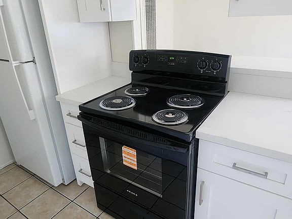 Newly renovated bathroom and new kitchen cabinets and range stove.