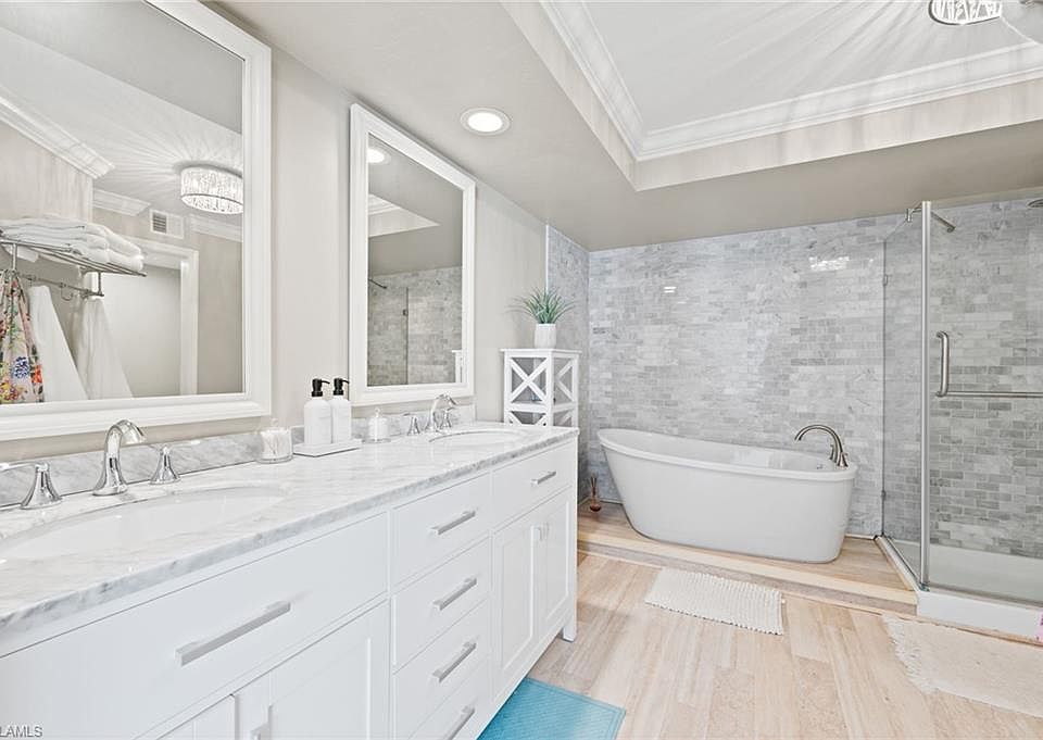 Sought-after first-floor condo in one of Naples’ most private and peaceful communities. This 2-bedroom, 2-bathroom unit offers 1,488 sq ft, including front and back patios, with a thoughtfully designed living space for comfort and ease of living. The open layout features colored laminate flooring throughout and a spacious covered lanai. The kitchen and bathrooms include custom vanities with quartz countertops and seamless glass shower doors. The primary suite offers dual sinks, a soaking tub, and a separate walk-in shower. Hurricane-impact windows throughout offer year-round peace of mind, and the building has sustained no flooding. A detached one-car garage provides extra storage and includes an attic for added convenience. Select furniture pieces are negotiable. Ideal for seasonal use or year-round living, residents enjoy a beautifully maintained setting with a private pool, all just minutes from the world-class dining, boutique shopping, and pristine beaches of 5th Avenue and 3rd Street South. Units in this quiet condominium complex rarely hit the market. Don’t miss your chance to experience the Naples lifestyle at its finest.