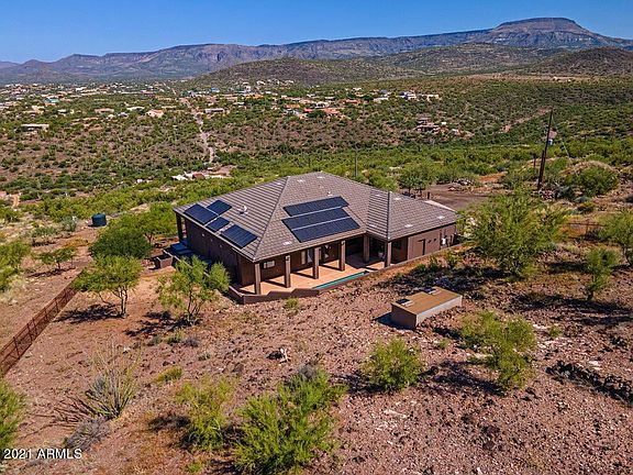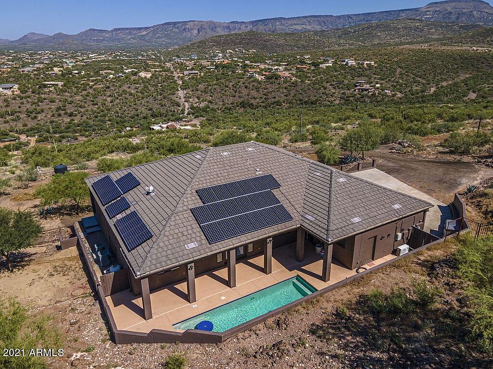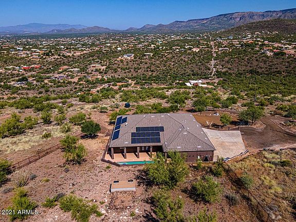 Looking for privacy and seclusion This is it! Desirable New River, Circle Mountain area, elevated lot with rare to find panoramic mountain views, hiking, riding trails off the property, no HOA, bring your toys. Original owners, pride of ownership! Energy efficient home with owned solar panels, low electric bills, free high speed internet. Large covered patio, 3 bedrooms plus den, 3 baths, 3 car garage, single bay garage air conditioned set up as work shop with minisplit. Private backyard with Pebble Pool. Tastefully upgraded with maple cabinets, granite counter tops, black appliances, build in GE Monogram fridge, new interior and exterior paint, new carpet, move-in ready. Home warranty included! Adjacent lot to the west APN 202-20-577 for sale $125,000
