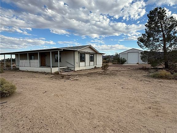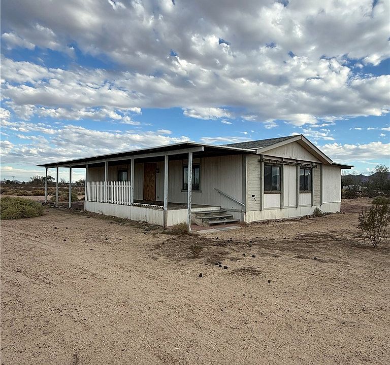 Endless potential! This 2 bedroom/2bathroom manufactured home on permanent foundation offers an opportunity for the buyer to add their own personal touch through remodeling. The property sits on 2.14 acres, is fully fenced, and includes a large metal workshop with roll up door. Power is already at the property in addition to a conventional septic system and domestic well. With a little sweat equity, this property could easily be transformed into a beautiful place to call home. The front and rear covered patios offer a perfect place to watch the sunrise and enjoy the beauty of the desert. The seller had trees and debris removed prior to listing and the carpet has been removed to create a blank slate. There is a central AC unit on the south end of the house and washer/dryer hookups in the laundry room. The open floor plan between the living and dining area creates a great space for family gatherings.