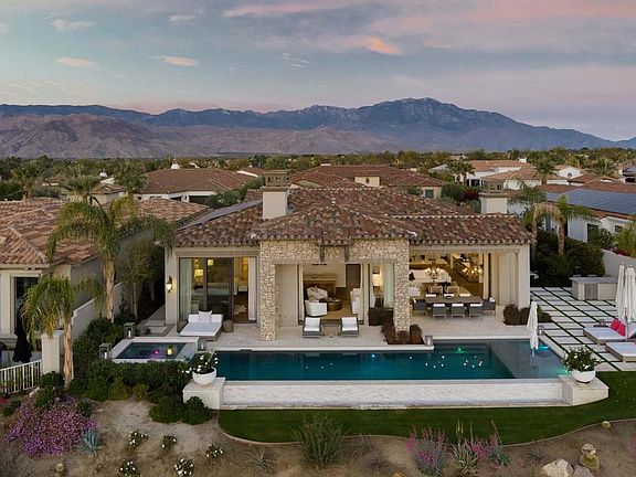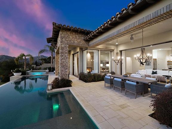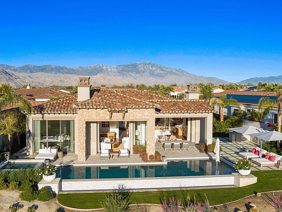 Situated on the 1st hole of the Jack Nicklaus Signature North Course at Toscana Country Club, this 4,064 sq.ft. modern contemporary home offers upscale desert living with stunning golf course and mountain views and abundant natural light throughout.Designed with a clean, open layout, the greatroom features two separate sitting areas--each with its own sleek fireplace--and pocket doors that open wide to a beautifully designed outdoor living area complete with a sparkling pool, spillover spa, and expansive patio space perfect for entertaining or relaxing under the desert sky. A stylish bar adds the perfect touch for effortless indoor-outdoor flow.The gourmet kitchen is both functional and beautifully appointed, with a large center island, modern cabinetry, and premium appliances. Pocket doors extend the space into the serene front courtyard, where a peaceful water feature and cozy firepit create an ideal setting for gathering or unwinding.Wood-look ceramic tile flooring runs throughout the home, adding warmth and sophistication while complementing the modern aesthetic.The spacious primary suite is a private retreat, complete with a third fireplace, a quiet sitting area, and an elegant en-suite bath featuring dual vanities, soaking tub, and a glass-enclosed walk-in shower. Two additional guest rooms in the main home, along with a detached guest house with kitchenette and private entry, offer plenty of room and privacy for visitors.Located within the prestigious gates of Toscana Country Club, this residence offers access to an exceptional lifestyle, surrounded by world-class amenities including two Jack Nicklaus Signature golf courses, a luxurious clubhouse, fitness and wellness facilities, fine dining, and more. With its seamless blend of modern design, comfort, and resort-style living, this home captures the essence of desert elegance.