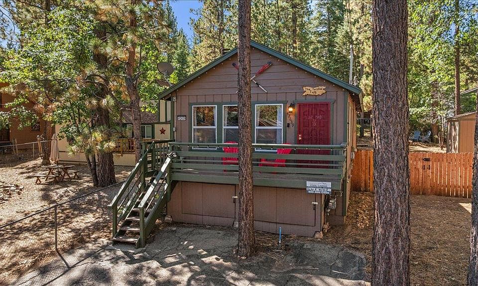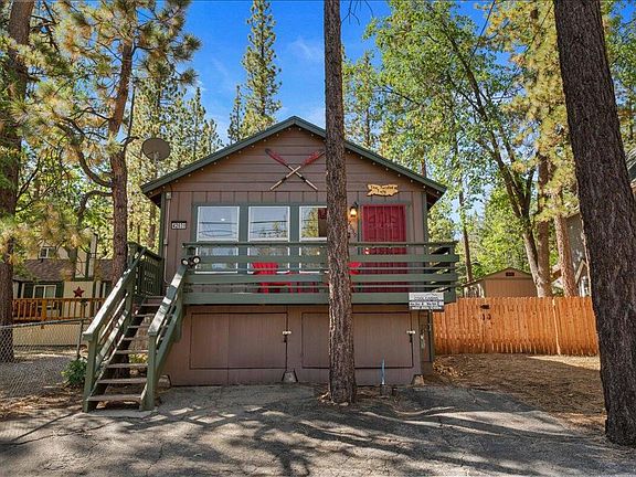 Tucked among the pines in one of Big Bear's most coveted neighborhoods, this modern and stylish 2-bedroom, 2-bath cabin offers the perfect blend of charm, space, and location. Situated on a level, double lot, the beautifully treed setting creates a beautiful, park-like atmosphere--complete with a backyard spa for soaking under the stars. Inside, newer pine tongue-and-groove paneling and a stunning brick fireplace set the tone for cozy mountain living. Natural light pours through picturesque windows in every room, framing serene views and enhancing the open, airy feel. The updated kitchen features fresh granite countertops, stainless steel appliances, and gorgeous wood laminate flooring throughout. Enjoy summer evenings or snowy mornings on the expansive patio deck or take advantage of the privacy-fenced RV/boat parking and generous outdoor space for year-round play. With a stack washer/dryer, two full bathrooms, and a layout that's ''just right,'' this cabin is as functional as it is inviting. Sold turnkey and ready to enjoy! Located minutes from Bear Mountain and Snow Summit ski resorts, golf course, the lake, Alpine Zoo, Village shops, and local coffee spots--with ski shuttles and forest trails within walking distance--this home is ideal as a vacation getaway, full-time residence, or income-producing rental. Short-term rental licensed and permitted. Don't miss this rare opportunity to own a slice of mountain magic in Lower Moonridge!