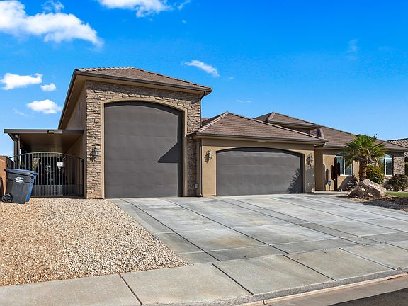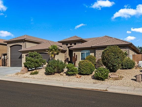 Cul-De-Sac, 45+' deep RV garage with a 12' wide x 14' tall door complete with a Mini Split heating and cooling system, 50 amp plug, storage cabinets up high with a work bench, beyond the RV garage there is an additional storage room with more cabinets plus a door out to the backyard, basin sink in the garage, water softener, recirculation pump, carport on the side of the RV garage that's perfect for small trailers, ATV's and other toys that you want to keep covered. Observation deck above the back patio with amazing views, fully enclosed yard, Generac 22KW natural gas backup generator. Large, open great room with coffered ceilings, natural gas fireplace with built-ins on the sides, spacious dining nook, stainless steel appliances, large primary suite with a door to the back patio... coffered ceilings, double vanities, double closet, walk-in-shower, jetted tub. Additional bedrooms are down a separate hallway away from the primary suite. South facing, original owners, Dixie Power. This home is OCCUPIED and SHOWN BY APPOINTMENT ONLY. Most interior pictures were taken in 2014 when the home was new. *All of the listing information is deemed reliable but not guaranteed, buyer to verify all.