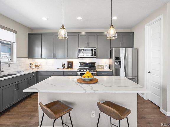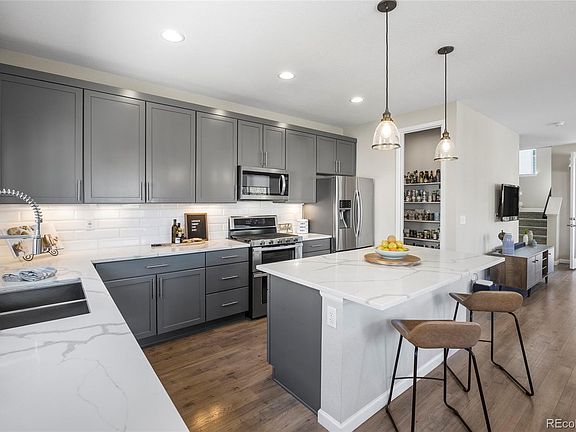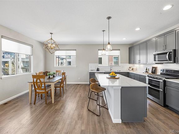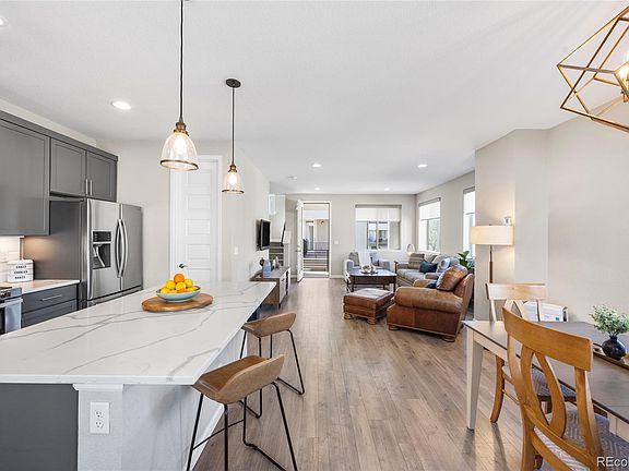 Three story, impeccably, stylish end unit townhome with 3 beds 3 baths, 2 car garage near the University of Denver, light rail station and neighborhood park. Enhancements include, high ceilings and many custom design options throughout. Welcome into the spacious entry highlighted by the wide planked vinyl flooring that extend up the stairs and into the second level living area. Here’s where you will spend time taking in some of those Mountain View’s from the west facing windows and all of the amazing natural light, creating meals in the stunning kitchen that offers an extensive island for prepping and entertaining, lit by gold toned pendant lighting, an abundance of graphite, shaker style cabinets equipped with soft close doors and drawers. The marbled quartz counters are an absolute statement and are highlighted by the bright, white subway tile backsplash all tied together with a stainless appliance package including a gas range, microwave, dishwasher and refrigerator. Plus enjoy the walk in pantry to store your food and small appliances. Windows surround the dining room which flows right into the generous sized great room with access to the outdoor space to enjoy the beautiful Colorado weather. Also located on this floor is a guest half bath. Third level offers the primary retreat with a private four piece luxury bath including a large shower with sleek gray tile and a frameless door, dual sinks and custom walk in closet with barn door, access two secondary bedrooms each with walk in closets that share a full hall bath with custom herringbone tile surround in the bath. Both baths host quartz vanity tops. Other features of this beautiful home are the laundry room with washer and dryer to be included, electric car charger, two outdoor living spaces, remote controlled blinds on second level and ample closets for additional storage and so much more. Great location with easy access to Cherry Creek, Downtown Denver and DIA. Come and make this your Denver Destination!
