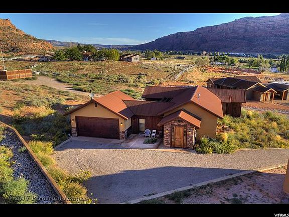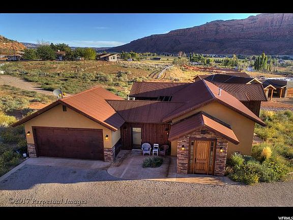 WESTERN ADVENTURE The gorgeous natural light and seamless indoor/outdoor living offered by this beautiful newer home will make you feel at ease in an instant. Tucked dramatically below gorgeous sandstone cliffs on just over a half acre dotted with sunflowers and native vegetation, the open-concept floorplan offers elegance and simplicity. Set on a quiet cul de sac, with easy access to hiking trails and expansive BLM lands, you will find the amenities of town an easy drive away, with the peace and quiet and start-studded night skies a priceless exchange for your truly short commute. The formal entryway is beautifully designed to welcome you to the home, as well as providing exceptional transitional space to help with the organization of day to day life. The kitchen anchors the Great Room, with a massive island designed for conversation as well as cooking. Quality appliances, beautiful custom cabinetry, and exquisite rock countertops are some of the highlights of the kitchen. The vaulted, tongue and groove ceilings open the space beautifully, while the massive post and beam accents and the rock wall surrounding the gas fireplace bring a lovely natural feel to the space. The spacious dining area opens via sliding glass doors to a charming dining patio, tempting you out of doors. The living area is framed by the fireplace to one side and double sliding doors to the huge patio on the other. The half bath features color and artistry from Talavera tile accents and a hand-painted sink. There are two bright and open bedrooms with a lovely bath, highlighted by a hammered bronze sink. The main suite offers a walk-in closet and en suite bath with double vanity and tub with custom tiled surround. The expansive outdoor living offered by this beautiful home ranges from intimate corners perfect for a reading nook or casual dining area, to a large central patio the gently flows into the beautifully landscaped parcel in a sea of flowering native vegetation. The viewscapes are stunning, with slickrock cliffs behind and the gorgeous red rocks of the Moab Rim framing your horizon. The White Horse locale itself is extraordinary and unique, offering a lifestyle oriented to the outdoors and dynamic Moab living, with a special sense of community and beautiful tracts of open space. Bring your sense of adventure, your joy for Western life, and move right into this special home!
