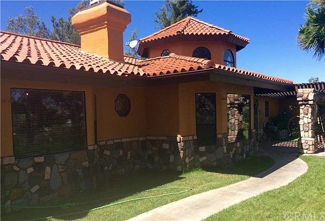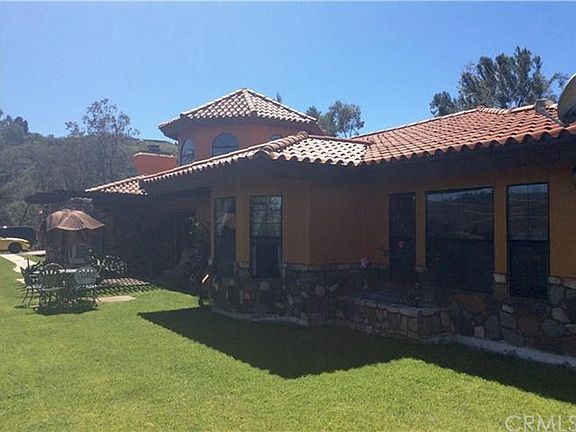 Spanish hacienda style custom home in De Luz on 4.98 acres. This home sits at the top of the hill and has beautiful views of the surrounding areas. Three bedrooms, two and one half bathrooms, sauna in master bathroom. Large kitchen with breakfast bar and breakfast nook, formal dining room. Kitchen opens to a large family room that includes a bar and a cozy fireplace, perfect for entertaining. This home has custom paint throughout, hardwood floors, custom ceiling beams, custom lighting, and many Spanish rustic touches. Small avocado grove of approximately 40 avocado trees as well as various citrus trees and pomegranate trees. There's an additional graded pad ready to build guest or in-law quarters.