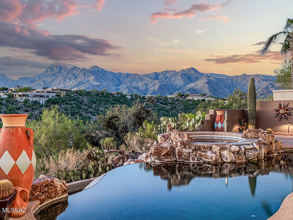 Perched high on a ridge in Sabino Mountain with 360 Views! Located in one of Tucson's most prestigious gated communities, this stunning home offers breathtaking panoramic views. Enjoy sweeping vistas of the Catalina, Rincon, Santa Rita and Tucson Mountains, as well as sparkling city lights--all from your own backyard. Designed for both relaxation and entertaining, the backyard features a built-in barbecue, sparkling pool, and a spa--perfect for enjoying Arizona's sunsets. Inside, the spacious great room seamlessly connects to the fully equipped chef's kitchen and dining area. The kitchen is a delight with granite countertops, walk-in pantry, gas cooktop and double ovens. High ceilings and expansive windows fill the home with natural light. Each generously sized bedroom has its own private bathroom, and there is abundant storage throughout, including a three-car garage. Additional highlights include: A fully owned solar system for maximum energy efficiency, indoor and outdoor fireplaces for cozy evenings, fresh interior and exterior paint and brand-new AC units. This home is the perfect blend of luxury, comfort, and unbeatable views--a true Sabino Mountain gem.