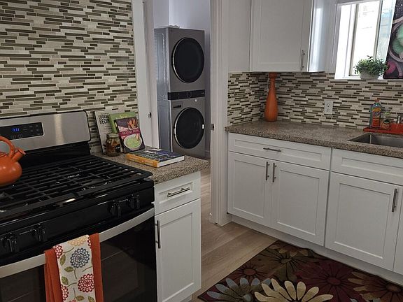 Located in Leimert Park, this Mediterranean inspired upper 2-bdrm and two bath duplex has been completely renovated. It includes a spacious living room with arched ceiling, fireplace and picturesque view of the neighborhood. The formal dining room can accommodate several guests and is a great space for dinner gatherings. The newly remodeled kitchen has stainless steel refrigerator, gas stove and vented hood, white shaker cabinets with soft closing doors and drawers, and imported solid surface granite countertops. The eat-in breakfast room with its built-in cabinet can be converted to an in-home office. The separate laundry room has an LG front load full-size washer & dryer. The primary bedroom is huge and has two walk-in closets plus an en suite bathroom. The 2nd bedroom is a generous size. The second bath is stunning and has a tub with separate shower. New vinyl windows. New wide plank wood floors throughout. New mini blinds. Interior freshly painted. New copper plumbing. New electrical. Detached garage for single car. Private front courtyard with enchanting garden--where butterflies abound. Owners reside downstairs. No pets or smoking. Close to Metro rail and bus lines. Restaurants, retail shopping nearby. Available for occupancy Nov 1.