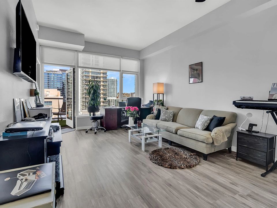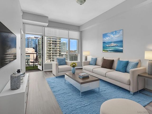 Welcome to this beautifully appointed residence in the heart of downtown San Diego’s East Village. This bright and modern condo offers a perfect blend of comfort and urban sophistication. Step inside to find an open-concept living space with large windows that fill the home with natural light and showcase breathtaking city views. The contemporary kitchen is equipped with granite countertops, stainless steel appliances, and rich wood cabinetry, making it ideal for both cooking and entertaining. The spacious living area flows seamlessly to a private balcony—perfect for enjoying morning coffee or evening sunsets while overlooking the vibrant city skyline. The bedroom retreat features ample closet space, while the bathroom is tastefully designed with granite counters and modern finishes. This secure, amenity-rich building offers everything you need for a dynamic downtown lifestyle, including a rooftop deck with BBQs and lounge areas, a fitness center, and inviting common spaces. Located steps away from Petco Park, top-rated dining, nightlife, and shopping, this home is an unmatched opportunity to live in one of San Diego’s most desirable urban neighborhoods. Don’t miss your chance to own a piece of downtown luxury living!