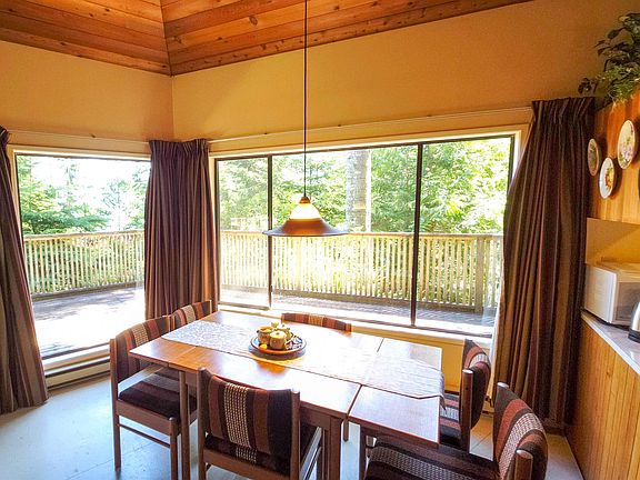 Affordable classic yurt-shaped 3-bed cabin with a peek-a-boo ocean view, steps from popular East Beach. This cabin has a vintage vibe with vaulted wood ceilings and a floor-to-ceiling brick fireplace with insert and electric baseboard heating for year-round use. Comes with all furnishings and sits on a 4889 sqft lot with a useful wrap-around sundeck. Some updates include a newer metal roof, hot water tank and refrigerator. This is a great starter cabin that has been well-built but in need of some TLC. Located a 5 min walk from the Eastbourne dock that is serviced by a quick 30 minute direct water taxi ride from Horseshoe Bay or a foot ferry from Langdale ferry. Great cell service and internet is available. Call for more details today!