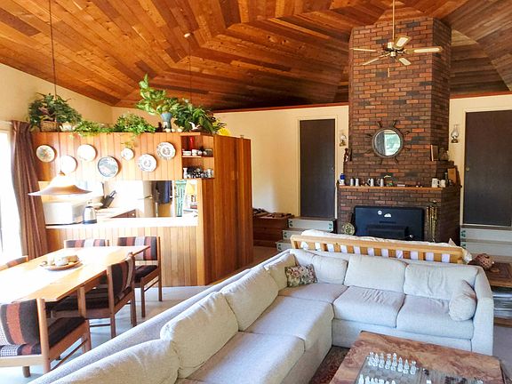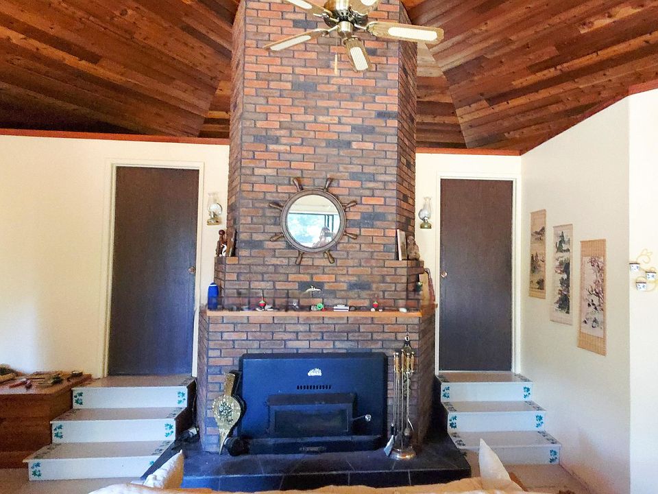 Peek-a-boo ocean viewVintage vibeVaulted wood ceilingsFloor-to-ceiling brick fireplaceElectric baseboard heatingUseful wrap-around sundeckNewer metal roof