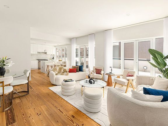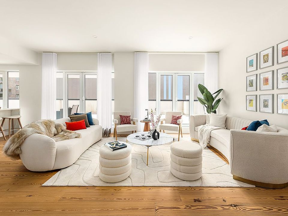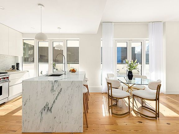 Inside, the keyed elevator opens directly into a sun-drenched, nearly 50-foot-wide great room with 10-foot ceilings, oversized French casement windows, and wide-plank white oak floors. The expansive living and dining area seamlessly connects to the terrace, creating a fluid, loft-like feel with stunning natural light throughout.