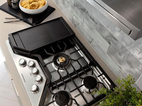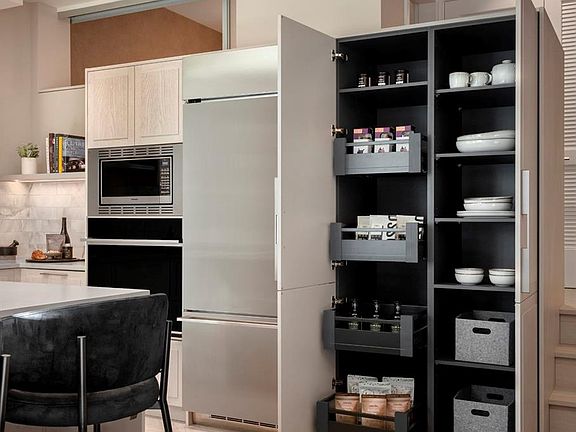 Herringbone-patterned engineered oak floorsChef-inspired kitchenItalian ash cabinet doorsAmple storageBuilt-in desk