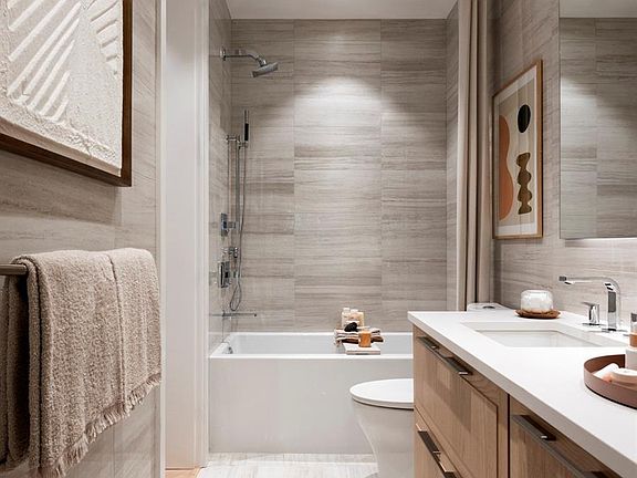 Welcome home to Oakwoods by Aragon! This stylish 1 bdrm/1 bath features 9’6” ceilings, 8’ solid-core interior doors & gorgeous herringbone-patterned engineered oak flooring. Chef-inspired kitchen includes a full-size gourmet GE Monogram appliance package with 5-burner gas cooktop, polished tile backsplash & Italian ash cabinetry with floor to ceiling pantry. Sleek folding, frosted glass doors open up your bedroom to the main living area which includes an expansive wainscoted feature wall. Walk-through custom closet with built-in drawer connects bedroom to spa-like bathroom with soaker tub & ample storage. Building features geothermal heating & cooling for year-round comfort, a well-equipped fitness centre & European-style courtyards with manicured gardens. Located in the Saxe Point neighbourhood of Esquimalt just minutes from downtown Victoria, Oakwoods by Aragon is the centre of a master-planned community that’s been over 10 years in the making. Move in this Fall!