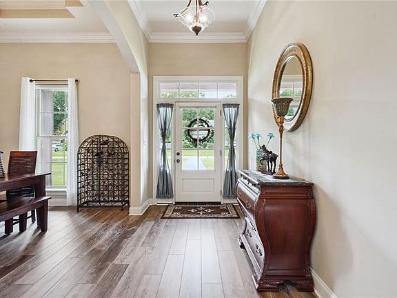 ***CHECK OUT THE ASSUMABLE VA LOAN: 3.49% interest rate! *** A TRUE SHOWPLACE / YOU'LL BE PROUD TO PLAY HOST *** Entertain in style & elegance in this stellar property that combines the best of modern amenities and superior craftsmanship, all nestled on a desirable .34 acre corner lot w/swaying palms located in NORTHSHORE HIGH SCHOOL DISTRICT. Have year round use of the HEATED INGROUND POOL WITH SPA, controlled via app/wifi, offers a private oasis for relaxation or entertaining. FLOOD INSURANCE NOT NEEDED. As you step inside, you'll be greeted by soaring 11 ft ceilings & updated luxury vinyl plank flooring, setting a tone of classic elegance throughout the home. The large open floor plan seamlessly connects the living areas, highlighted by a stunning brick arch leading into a well-appointed kitchen and dining room. Here, cooking becomes a delight with smart appliances, gas stove, granite countertops, a desirable backsplash, and a center work island (with plenty of extra cabinets), great for gathering and casual meals. The living room, designed for both relaxation and entertainment, features a radiant gas fireplace and pretty neutral colors that complement the modern finishes. Venture outside to the private serenity of a screened-in back porch overlooking a lush landscape. House has convenient half bath for pool guests. Retreat to the luxurious primary bedroom boasting a multi step ceiling with beautiful crown molding. En-suite includes a large separate shower, an oversize tub & granite vanities, creating a spa experience. Inside laundry with sink. This home blends functionality with luxury, making it a perfect sanctuary for anyone looking to enhance their living experience. Stainless Samsung "Smart" refrigerator w/cafe doors on bottom to stay; 2022 new $16,500 flooring. Gutters, ADT Sec System, NEST thermostat, NEW HVAC AIR HANDLER 2024, SPRAY FOAM INSULATION.