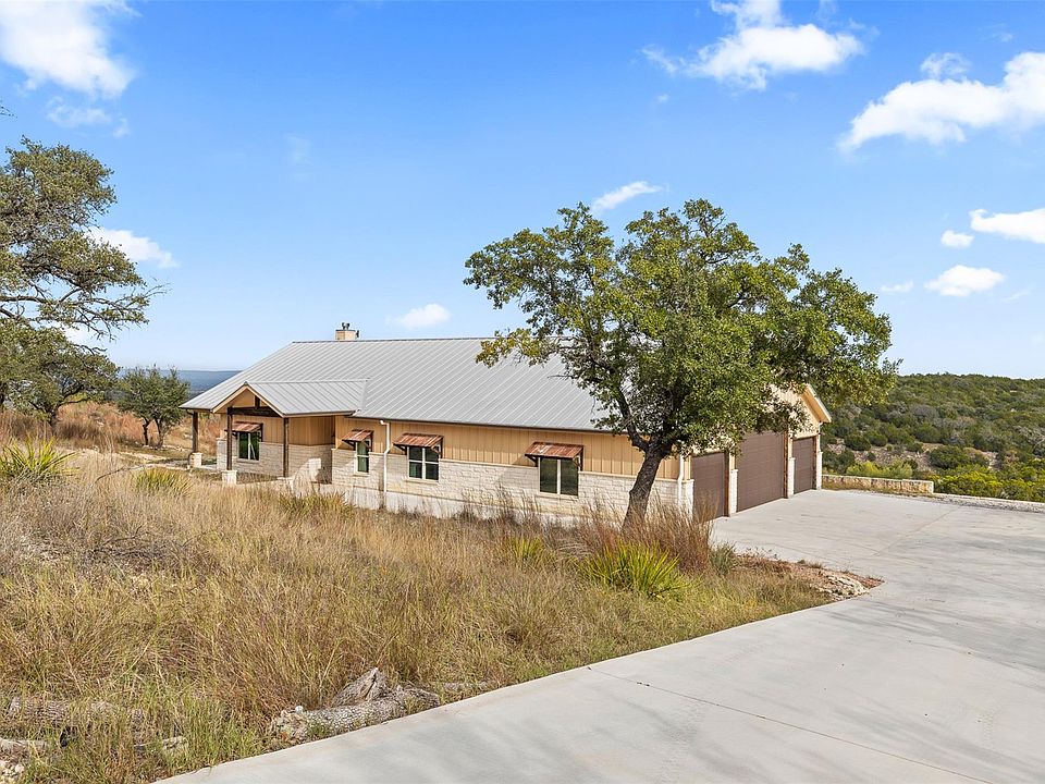 Experience peaceful country living on 3 private acres with beautiful Hill Country views. This white-stone home sits at the end of a long driveway and welcomes you with a charming wraparound patio perfect for relaxing and taking in the scenery. Inside, the island kitchen opens to the dining area and spacious family room, complete with a large fireplace that creates a cozy gathering space. Concrete flooring runs throughout the home, and the kitchen and bathrooms feature granite countertops for a clean, timeless look.The MIL floor plan offers privacy, with the primary suite located just off the family room. The primary bathroom includes a walk-in shower, double vanity, and a generous walk-in closet. On the opposite side of the home, you’ll find two guest bedrooms and a full bathroom.A utility room with pantry and sink leads out to the oversized 3-car garage—where the middle bay is tall enough to accommodate a motorhome.A rare combination of privacy, views, and practical living—this home is ready to welcome its next owner. Refrigerator, washer and dryer convey. There is no survey.