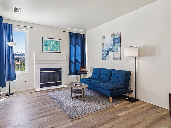 This 2-bedroom, 2.5-bath home welcomes you with airy high ceilings in the living room and an abundance of natural light. The elevated south-facing yard with turf provides a low-maintenance retreat, while inside, luxury vinyl plank floors and a kitchen with white tile counters and distressed wood cabinetry set the tone for relaxed everyday living. Upstairs, the spacious primary suite features vaulted ceilings, a walk-in closet, dual vanity, and a soaking tub, perfect for unwinding after a long day. Additional highlights include dual-pane windows, an attached one-car garage, a reserved guest parking spot, and access to a community playground, pool, and jacuzzi. Conveniently located across from a shopping center, this home offers comfort, convenience, and charm, you’ll love both the residence and the community.