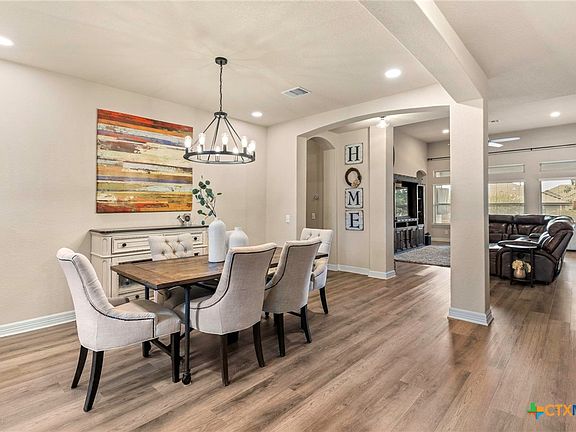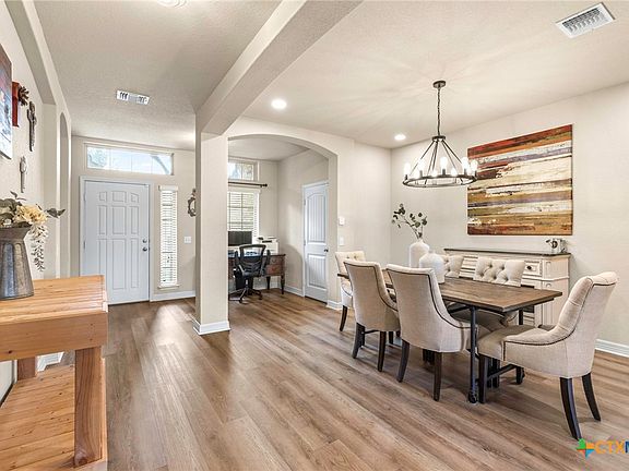 Inviting 4-bedroom, 3 full bath home offering the perfect layout for both comfort and entertaining. The open concept design showcases warm wood-look floors, arched entryways, and a stunning kitchen with granite countertops, stainless appliances, a large island, and custom brick accents that add character and charm. The split-bedroom layout provides privacy, while the spacious primary suite features a tray ceiling, soaking tub, separate shower, dual vanities, and an oversized walk-in closet. Step outside to an entertainer’s dream backyard with a covered patio, outdoor TV setup, grilling station, built-in bar, firepit area, and playscape—all within a fully fenced yard ready for gatherings. Ideally located within a mile of I-35 and minutes from San Antonio and Austin, this home checks every box—and homes like this don’t last long in New Braunfels!