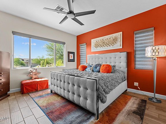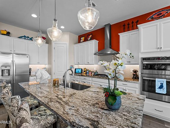 This beautifully upgraded Hotel California model in Wickenburg Ranch offers the perfect blend of elegance and functionality. Situated on a premium corner lot, the home features 2 bedrooms, 2.5 bathrooms, a rare find for this model, and an open floor plan designed for modern living. The upgraded kitchen boasts a large island and a premium gas stove package, ideal for home chefs and entertaining. The guest bedroom is thoughtfully extended by 2 feet, complete with an en suite bathroom for added privacy. The entire home showcases unique upgrades with stylish tile flooring, upgraded lighting fixtures, and ceiling fans throughout. Outside, the spacious backyard impresses with extensive landscaping and a large paver patio, perfect for outdoor gatherings.