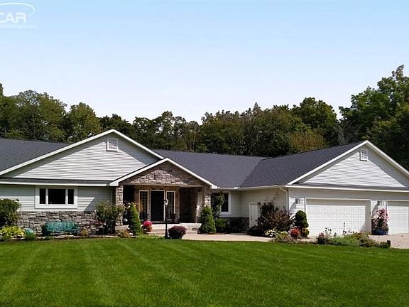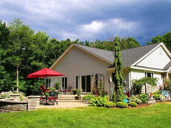 Brick ranch with geo thermal heat, 4 car garage on almost 4 acres, VERY private. Tucked way off the road surrounded by nature. Custom EVERYTHING! Master suite is complemented by a 13x15 master bath with multiple shower heads, all ceramic/glass. Gourmet granite kitchen with island big enough for any feast. Great room flanked by floor to ceiling windows, the view will take your breath away. Living room features stainless steel fireplace mantel and snack bar. Expansive first floor laundry, foyers, mud room, 4/5 ft hallways plus much more. Two tiered uni-lock massive patio. Professional workout room. Please see agent for list of custom craftsmanship details.