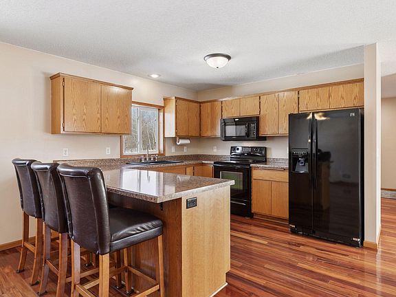 Welcome to your new home, a well-maintained walkout rambler with 3 bedrooms, 2 bathrooms, and an attached 3 car garage nestled on a private 6-acre lot. Inside is an open layout highlighted by beautiful wood floors in the kitchen and dining areas. Sleek black appliances, plentiful storage, updated counters, and a spacious breakfast bar in the kitchen make it perfect for day-to-day life and for entertaining. There are two bedrooms on the main and a walk-through bath with a separate soaking tub and a large walk-in ceramic shower. Additionally on the main level is a generously sized laundry/mud room, providing ample storage and a place to leave your wet shoes or boots. In the lower level is a large finished family room, a perfect entertaining space with access to the expansive patio and serene backyard. The lower level also includes a third bedroom, a convenient 3/4 bath, and the potential to add a fourth bedroom. This home is equipped with a new furnace installed in January 2025. Along with the attached 3-car garage, there is an impressive 2-car detached garage/workshop with heating/AC and a separate 100-amp service, great for any hobbyist or mechanic. There are two smaller sheds that provide extra space for lawn and garden tools and a dedicated RV outlet for travelers. The roof is about 2 years old and the driveway is newer asphalt. You’ll love the convenience of the generator, ensuring you’re prepared for any power interruptions. This location is fantastic, 15 minutes to shopping in Cambridge or 8 minutes to North Branch and Hwy 35.